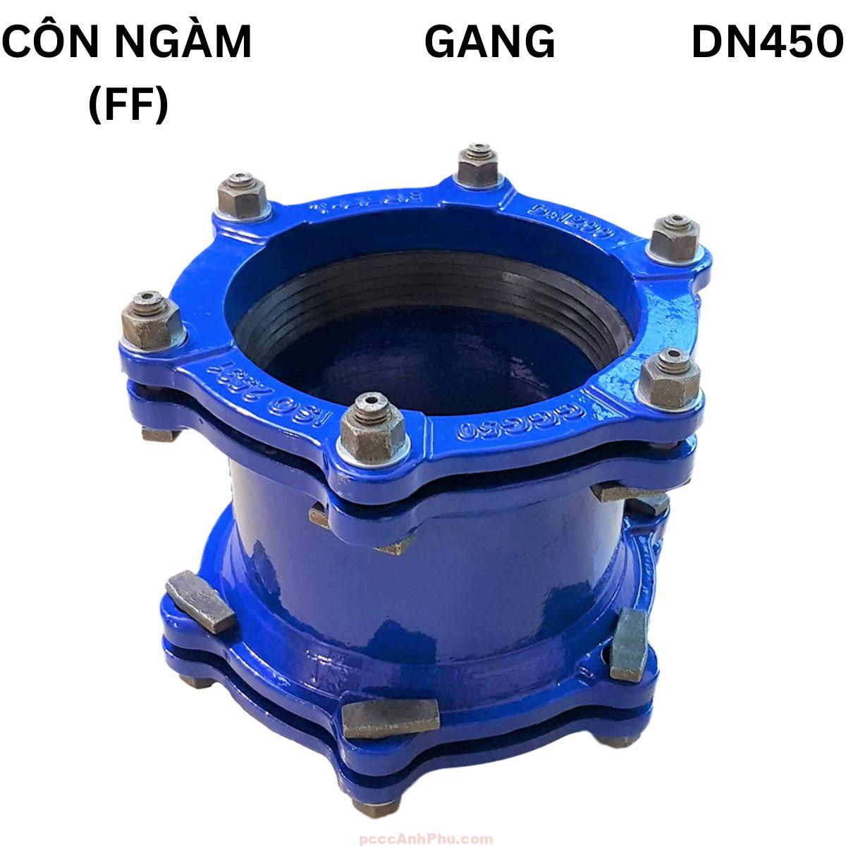 DN450 tương thích với dải đường kính DE 457 – 472 mm, có thể lắp với ống thép hàn, ống HDPE PN16, gang dẻo hoặc uPVC công nghiệp. Thân và hai nắp côn được đúc từ gang cầu EN-GJS-500-7 / FCD450-12 có độ bền kéo cao, chống nứt và biến dạng tốt. Toàn bộ bề mặt phủ epoxy xanh, chống ăn mòn hiệu quả trong môi trường ẩm, nước biển nhẹ hoặc khí hậu nhiệt đới.
